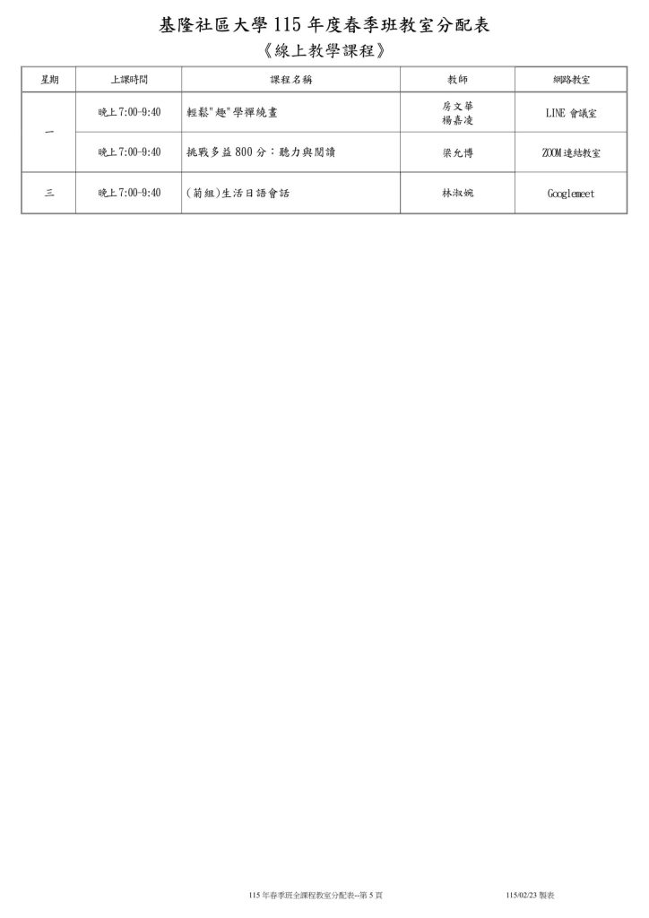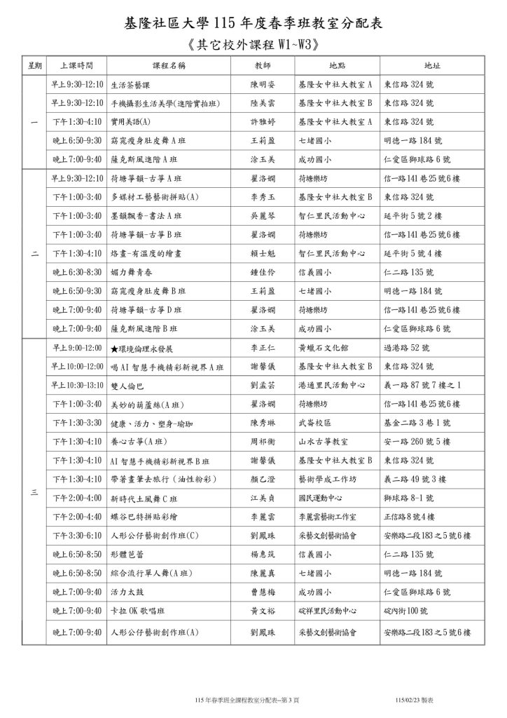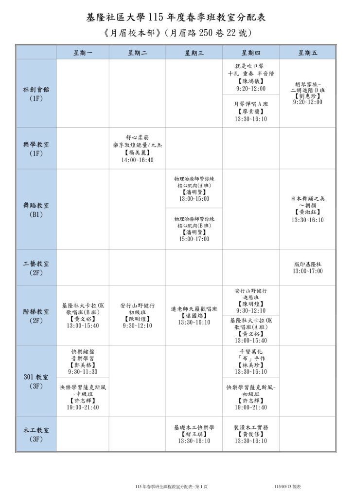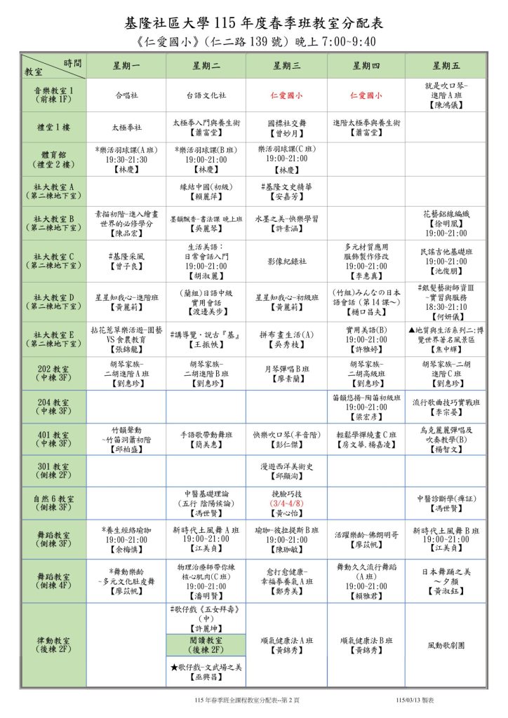 |公告| 115年春季班班級教室分配表 Post published:2026-03-02 Post category:最新消息 / 校務公告 Reading time:2 mins read 這是115年春季班班級教室分配表,請各位學員留意上課地點與時間,準時前往指定教室上課。(115.03.02 更新) 📌 溫馨提醒✅ 上課時請遵守教室規範,保持環境整潔。✅ 若有課程異動,將另行通知,請留意公告。✅ 如有任何疑問,歡迎洽詢學校辦公室或聯絡授課老師。 祝大家學習愉快,收穫滿滿! 🎉 Please Share This Share this content Opens in a new window Opens in a new window Opens in a new window Opens in a new window Opens in a new window Opens in a new window Opens in a new window Opens in a new window Opens in a new window Opens in a new window Read more articles Previous Post!!!基隆社大重要公告:防詐騙緊急提醒!!! Next Post3/13(五)因 仁愛國小 班親會活動,當日課程無法使用教室,敬請留意 You Might Also Like |免費講座|科技發展與媒體識讀~名額有限 2024-06-11 |展覽|黃蠟石文化館-「溫情暖暖-那段共同築夢的日子」特展 2023-11-30 112-2 基隆社區大學 公民素養週 開跑囉~<戶外場請點選下拉報名> 2023-10-24 |報名中|112年秋季班課程 9/4開課 2023-08-14 |新進課程|113年春季班新進課程招生暨社團宣導 2024-05-30 |報導|供時代-社大公共性博覽會基隆展登場 體現由下而上的公民實踐 2022-10-24 導覽社社團成立籌備會 2023-03-08