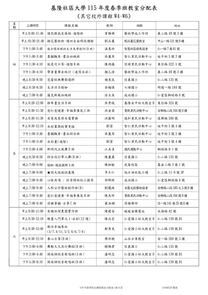 |公告| 115年春季班班級教室分配表 Post published:2026-03-02 Post category:最新消息 / 校務公告 Reading time:2 mins read 這是115年春季班班級教室分配表,請各位學員留意上課地點與時間,準時前往指定教室上課。(115.03.02 更新) 📌 溫馨提醒✅ 上課時請遵守教室規範,保持環境整潔。✅ 若有課程異動,將另行通知,請留意公告。✅ 如有任何疑問,歡迎洽詢學校辦公室或聯絡授課老師。 祝大家學習愉快,收穫滿滿! 🎉 Please Share This Share this content Opens in a new window Opens in a new window Opens in a new window Opens in a new window Opens in a new window Opens in a new window Opens in a new window Opens in a new window Opens in a new window Opens in a new window Read more articles Previous Post!!!基隆社大重要公告:防詐騙緊急提醒!!! Next Post3/13(五)因 仁愛國小 班親會活動,當日課程無法使用教室,敬請留意 You Might Also Like |免費講座|科技發展與媒體識讀~名額有限 2024-06-11 |展覽|黃蠟石文化館-「溫情暖暖-那段共同築夢的日子」特展 2023-11-30 112-2 基隆社區大學 公民素養週 開跑囉~<戶外場請點選下拉報名> 2023-10-24 |報名中|112年秋季班課程 9/4開課 2023-08-14 |保證金課程|草根媒體在社大-公民新聞報導與培力 2025-02-24 |抽獎|公民週5/19(五)FB粉絲頁直播抽獎 2023-05-15 |新聞報導|投入地方25年 基隆社大校長獲社會教育貢獻獎 2024-12-23