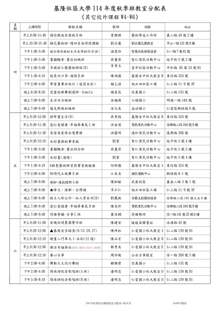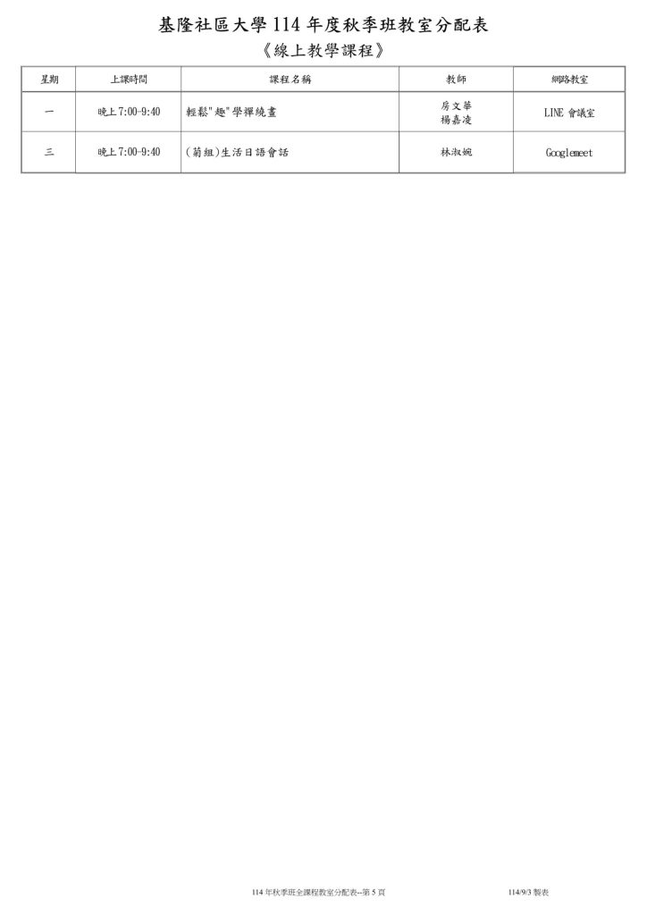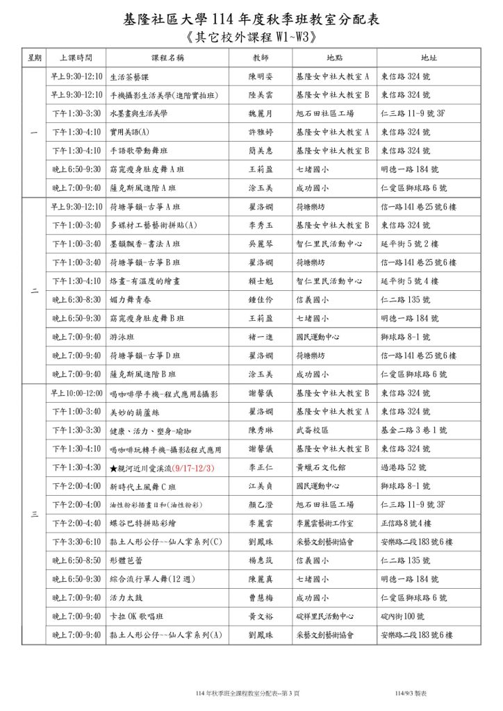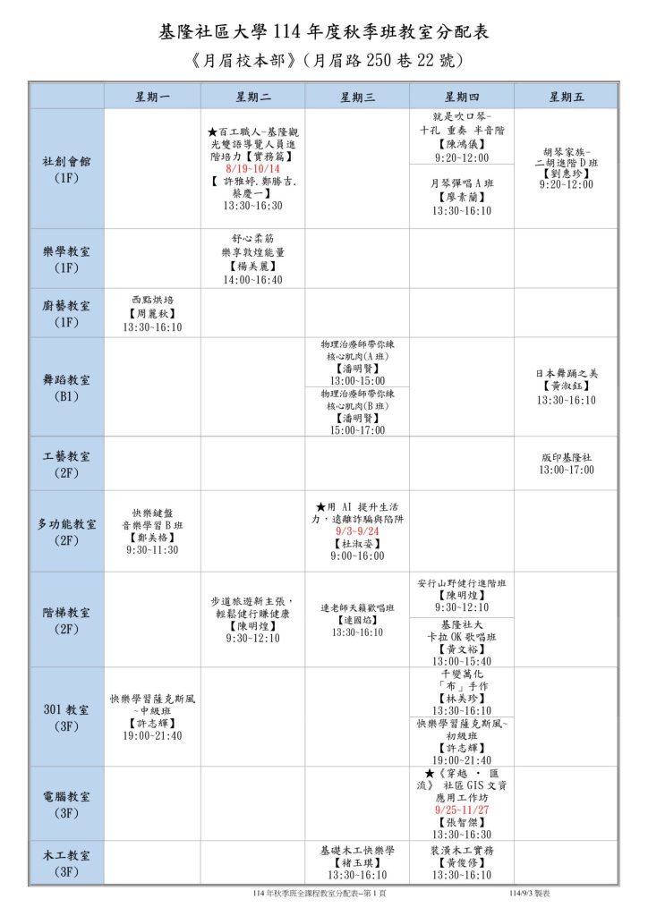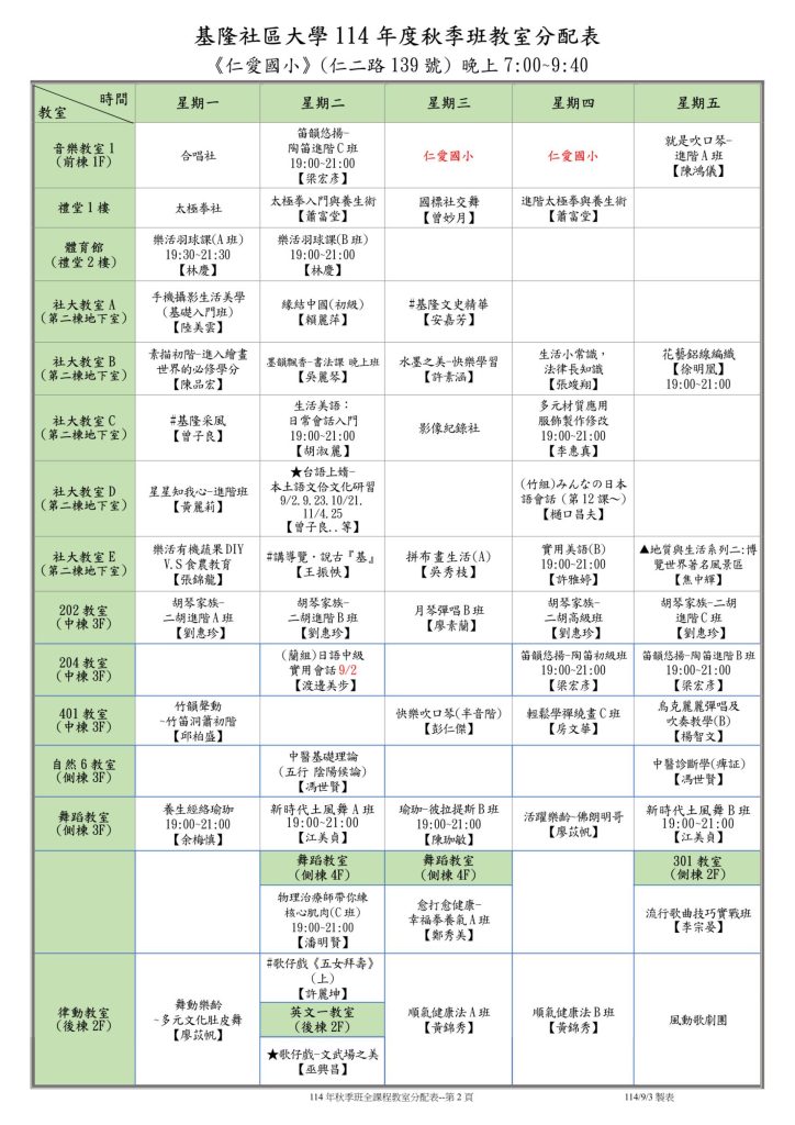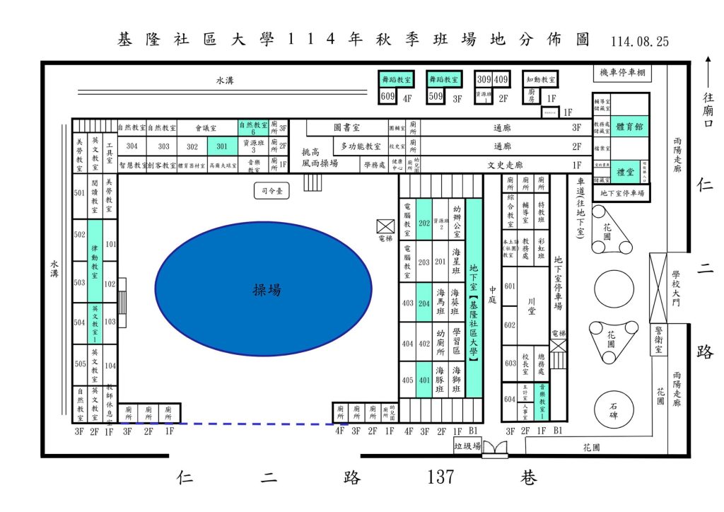 |公告| 114年秋季班班級教室分配表 Post published:2025-09-03 Post category:最新消息 / 校務公告 Reading time:2 mins read 這是114年秋季班班級教室分配表,請各位學員留意上課地點與時間,準時前往指定教室上課。(114.09.03 更新) 📌 溫馨提醒✅ 上課時請遵守教室規範,保持環境整潔。✅ 若有課程異動,將另行通知,請留意公告。✅ 如有任何疑問,歡迎洽詢學校辦公室或聯絡授課老師。 祝大家學習愉快,收穫滿滿! 🎉 Please Share This Share this content Opens in a new window Opens in a new window Opens in a new window Opens in a new window Opens in a new window Opens in a new window Opens in a new window Opens in a new window Opens in a new window Opens in a new window Read more articles Previous Post|保證金課程|《穿越 ‧ 匯流》社區GIS文資應用工作坊 Next Post|重要公告| 9/5(五) 晚上因中元祭進行交通管制,月眉校本部服務時間調整為 09:00-17:00,部分課程順延一週至 9/12(五) 開課班級以及當晚如期上課班級 You Might Also Like |免費講座|科技發展與媒體識讀~名額有限 2024-06-11 |展覽|黃蠟石文化館-「溫情暖暖-那段共同築夢的日子」特展 2023-11-30 112-2 基隆社區大學 公民素養週 開跑囉~<戶外場請點選下拉報名> 2023-10-24 |報名中|112年秋季班課程 9/4開課 2023-08-14 中秋節快樂! 社大辦公室 10/4(六)~10/6(一)休息三天 2025-10-04 賀!!基隆市112年度社區大學優良課程評選結果特優、優等 2023-11-07 |資訊轉知|2025年福爾摩沙北海岸藝術季自即日起至114年5月10日止招募導覽藝工。 2025-05-07