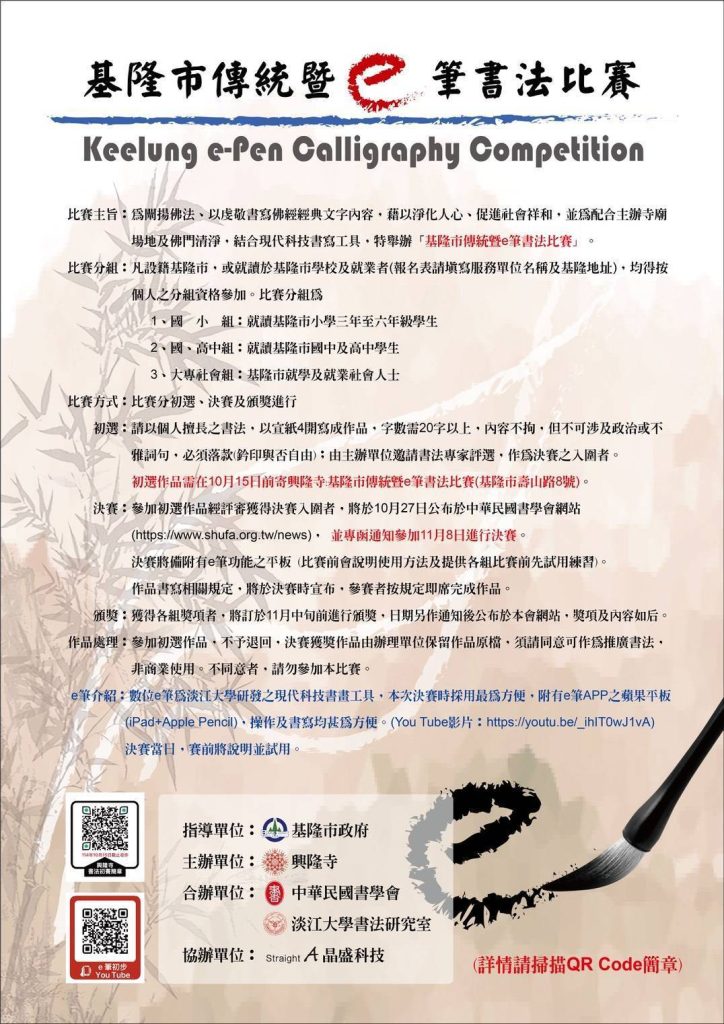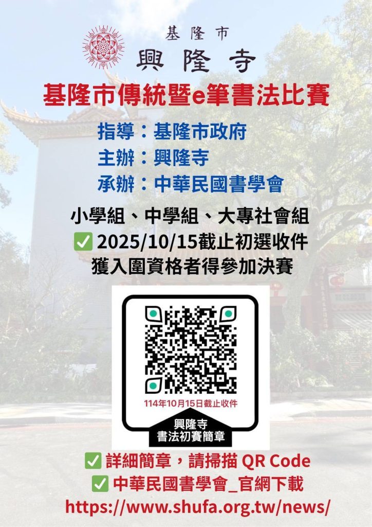 |資訊分享| 基隆市傳統暨e筆書法比賽 Post published:2025-10-03 Post category:多元櫥窗 / 好康報報 Reading time:1 mins read Please Share This Share this content Opens in a new window Opens in a new window Opens in a new window Opens in a new window Opens in a new window Opens in a new window Opens in a new window Opens in a new window Opens in a new window Opens in a new window Read more articles Previous Post|資訊分享| 🎉 基隆長輩照護平台 × 老鷹嘉年華加碼驚喜 🎉 You Might Also Like |免費講座|科技發展與媒體識讀~名額有限 2024-06-11 |展覽|黃蠟石文化館-「溫情暖暖-那段共同築夢的日子」特展 2023-11-30 112-2 基隆社區大學 公民素養週 開跑囉~<戶外場請點選下拉報名> 2023-10-24 |報名中|112年秋季班課程 9/4開課 2023-08-14 114年春季班新進教師課程招生暨社團宣導活動日程表 2025-06-05 |仁愛國小分部|112年秋季班開學提醒 2023-09-01 |場次更動|112春季公民週-5/1大禮堂場次 2023-05-01